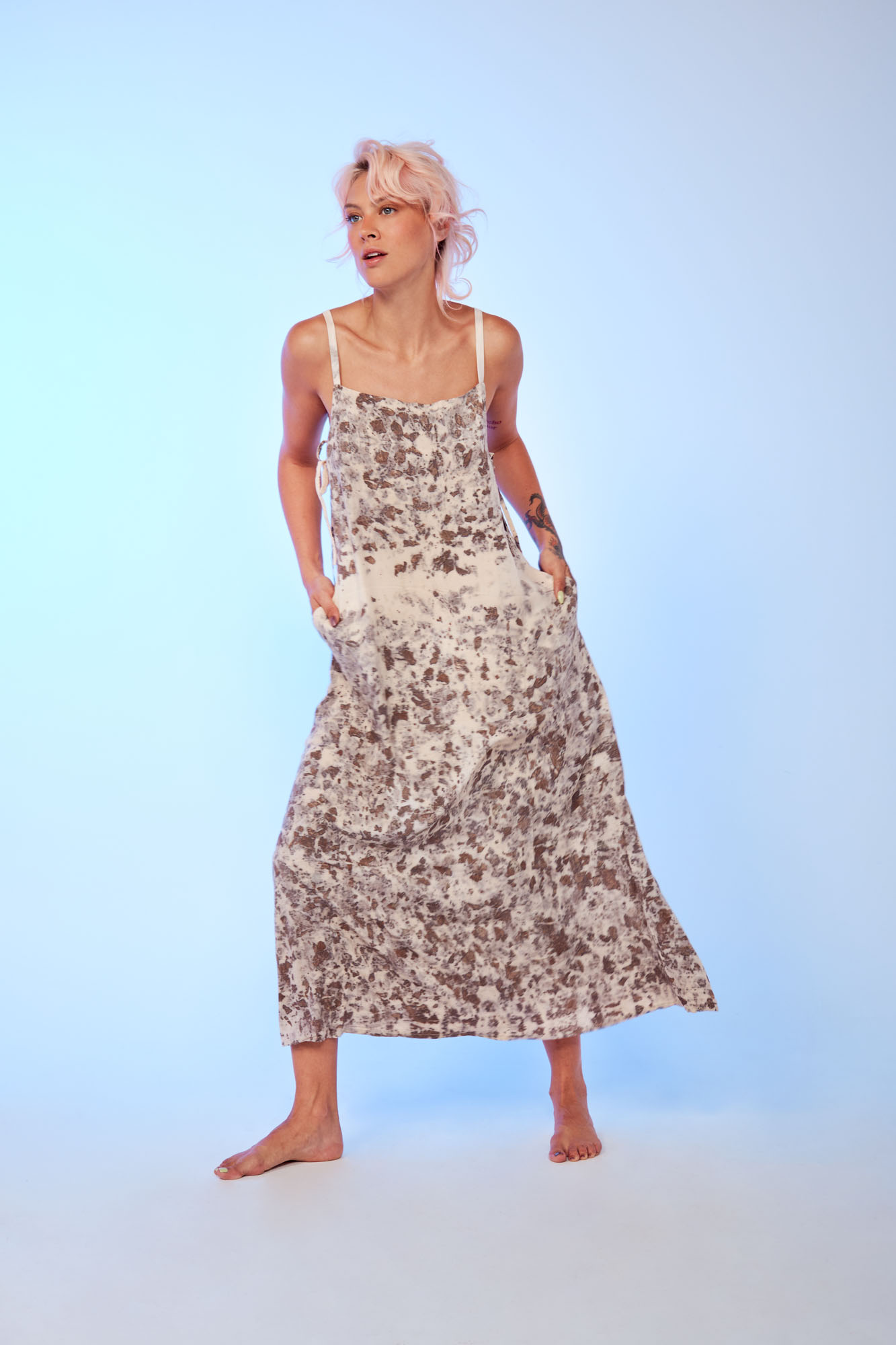 Envíos a nivel NacionalVestido ancho con abertura lateral para anudar, teñido con tintes naturales y estampado con plantas. Pieza única e irrepetible.