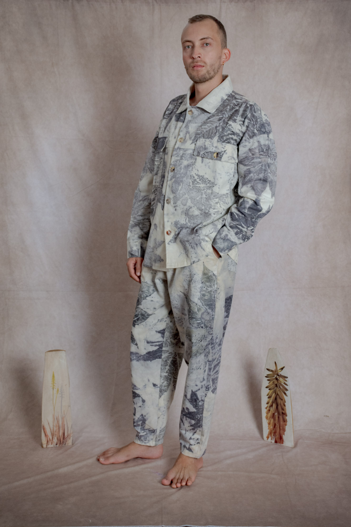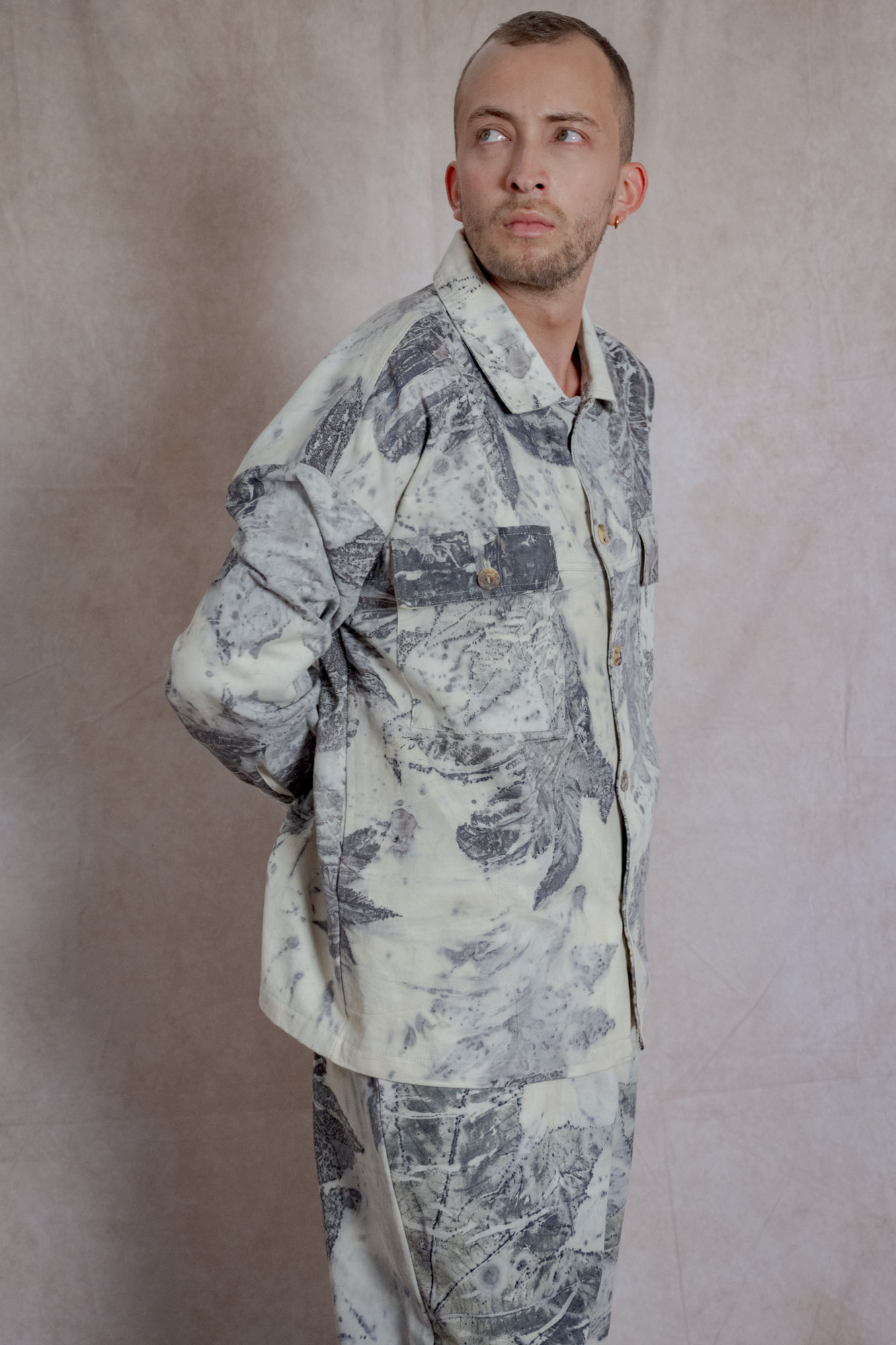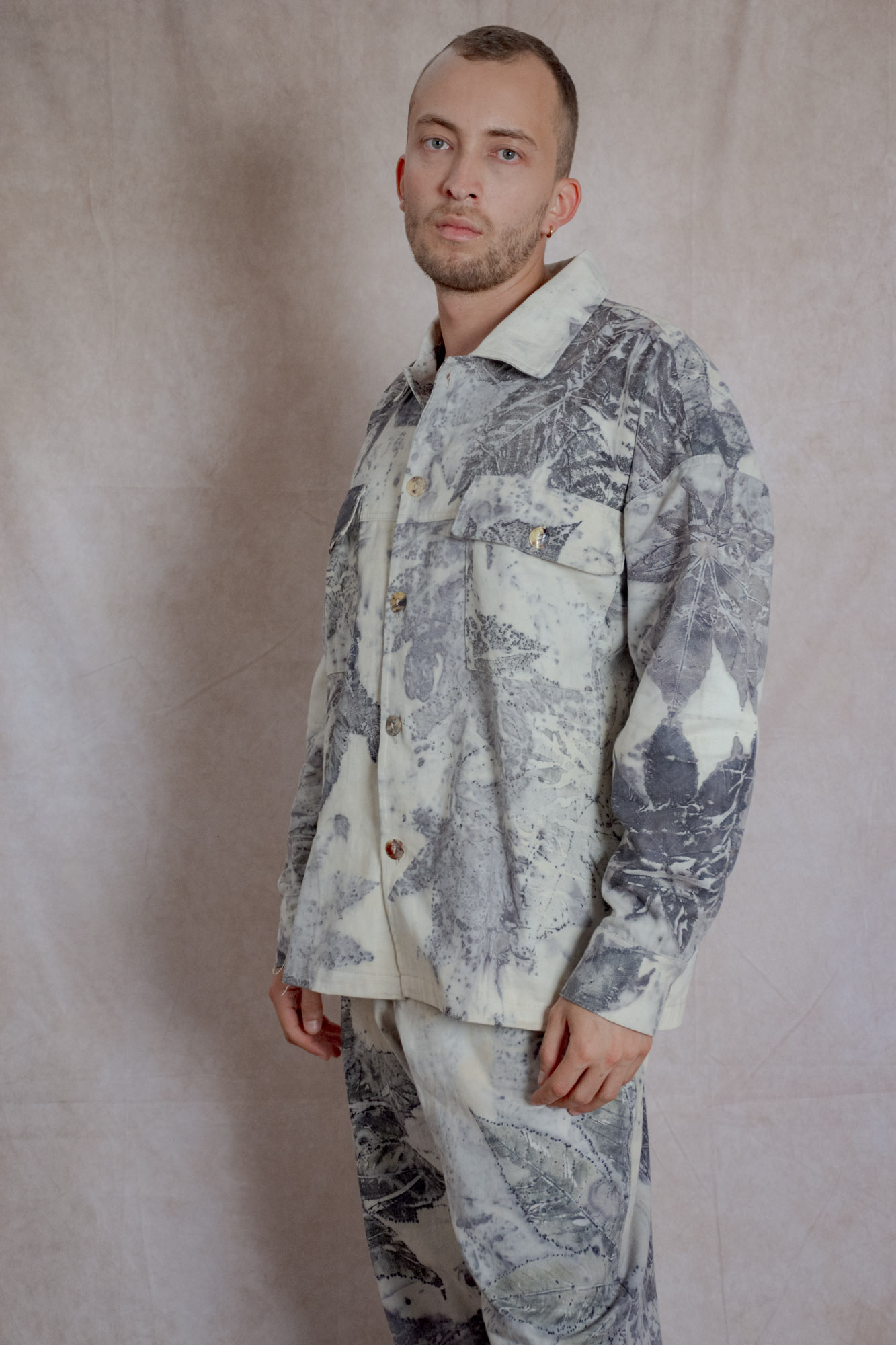 Envíos a nivel NacionalChaqueta estilo camisera con bolsillos frontales y laterales, teñida con tintes naturales y estampada con plantas. Pieza única e irrepetible.