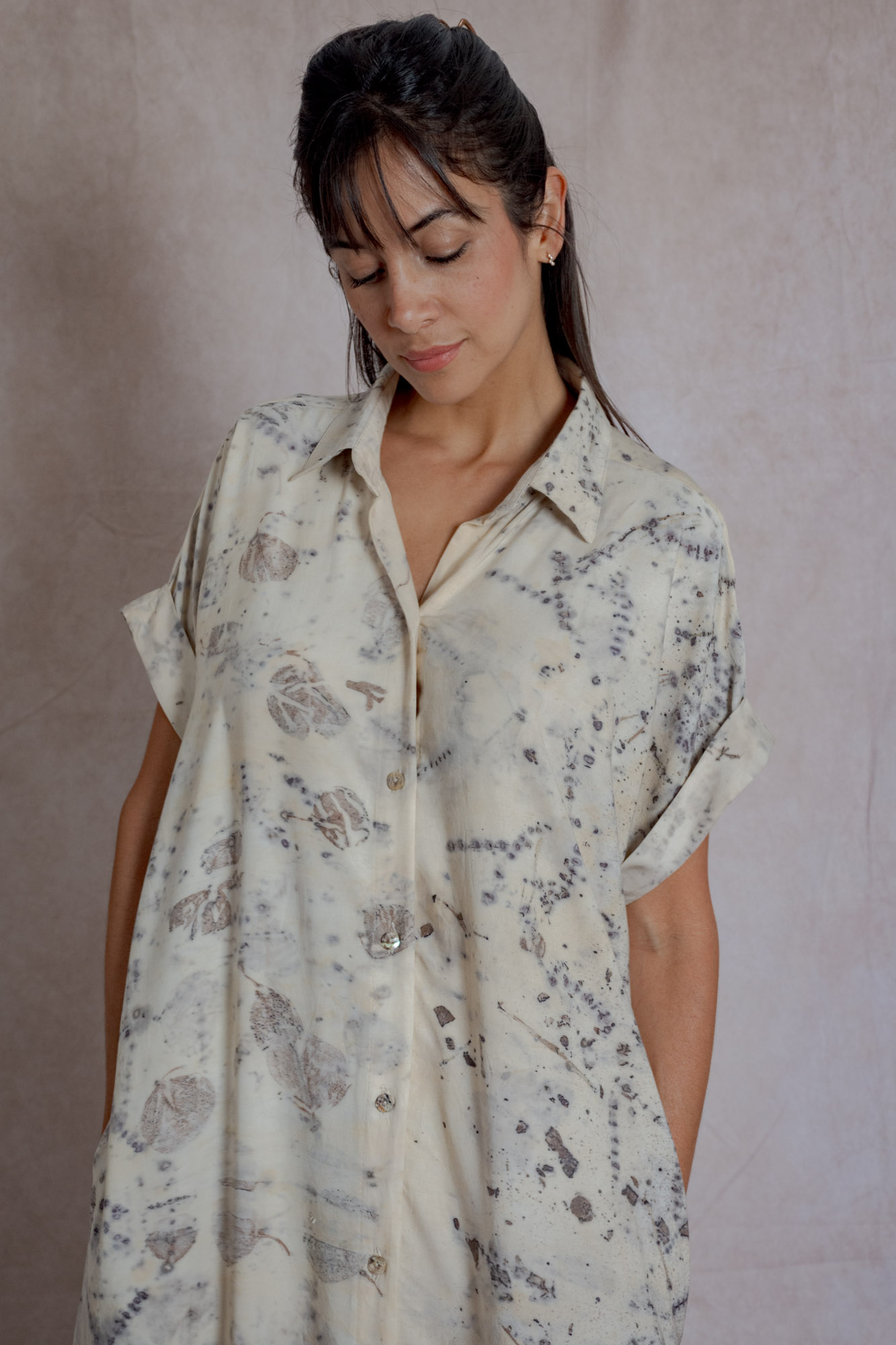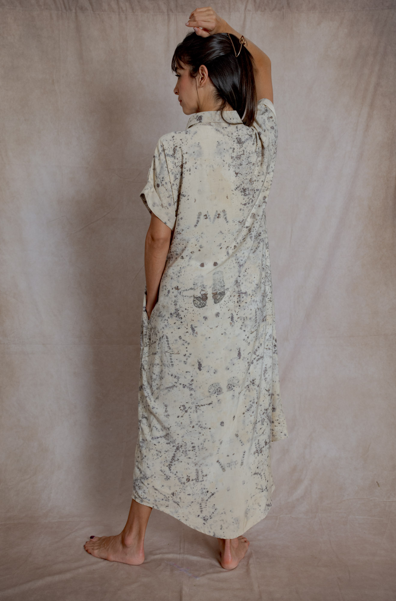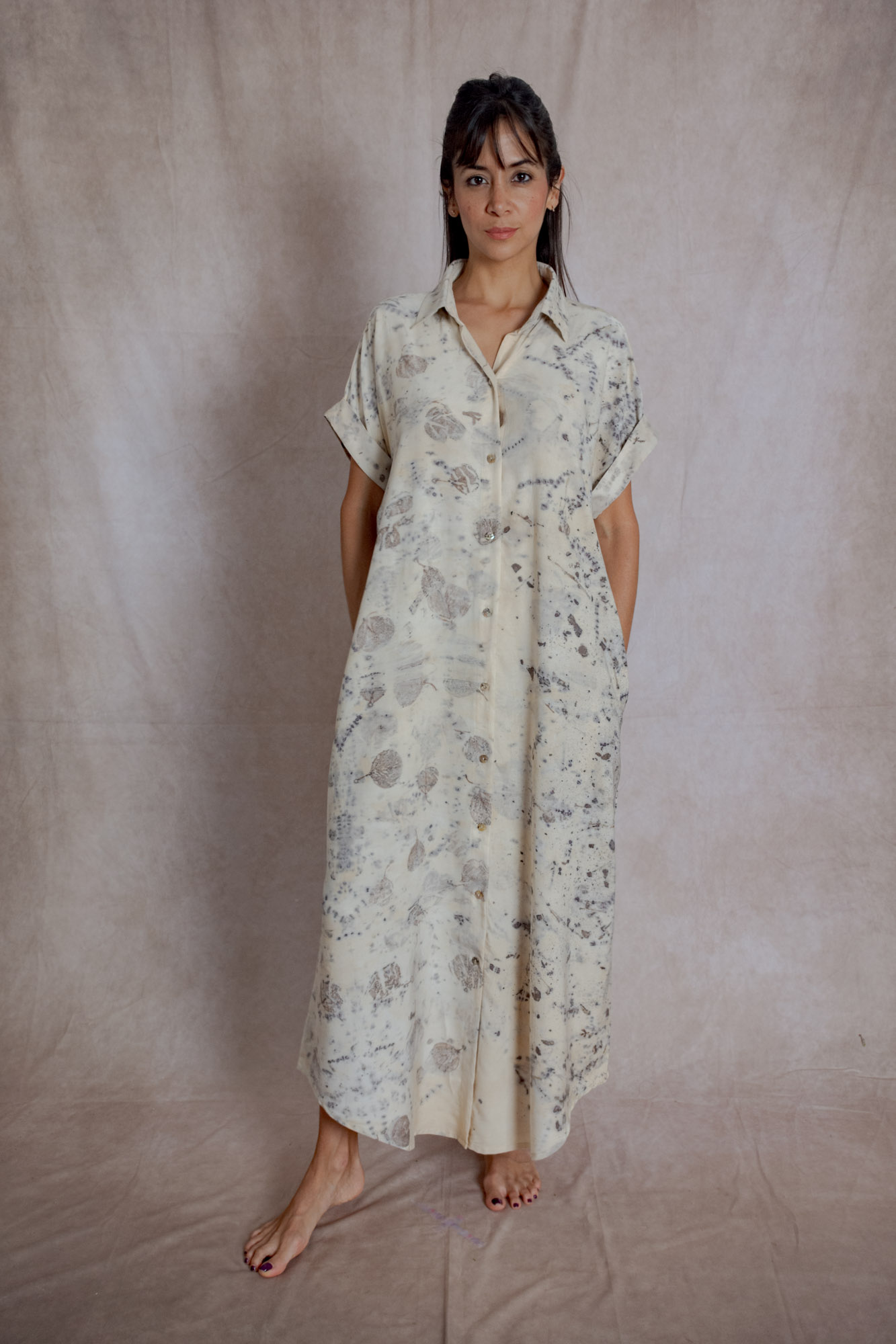 Envíos a nivel NacionalVestido camisón teñido con tintes naturales y estampado con plantas. Pieza única e irrepetible.