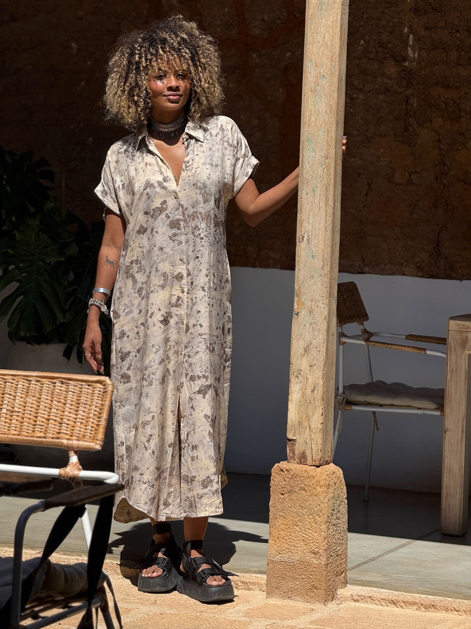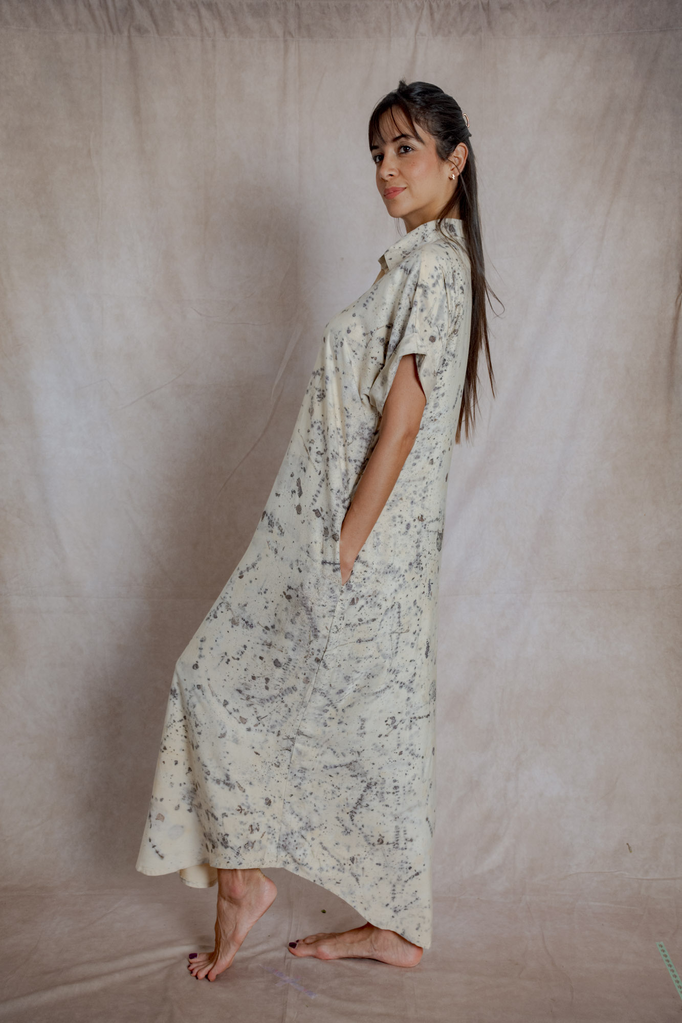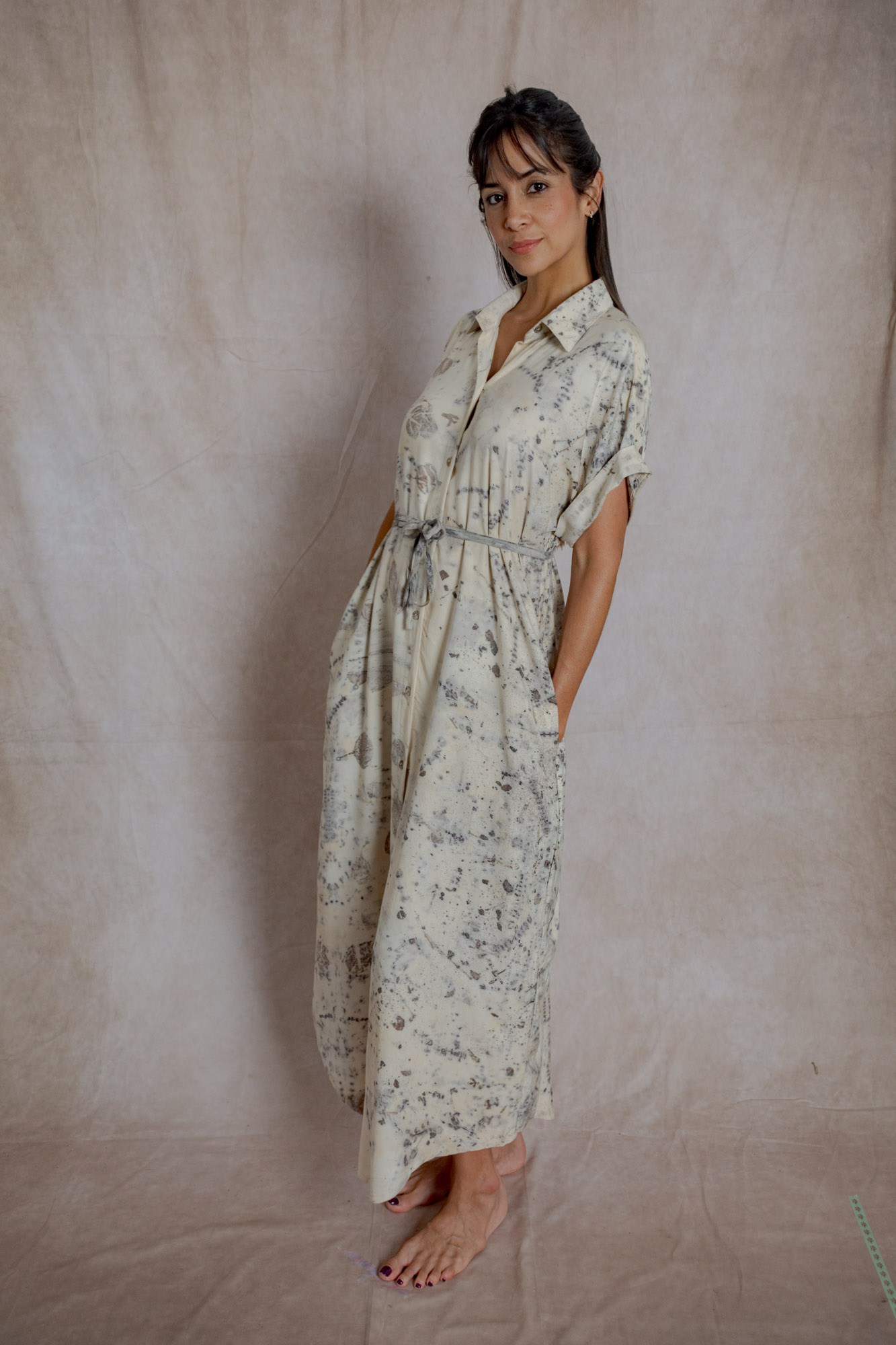 Envíos a nivel NacionalVestido camisón teñido con tintes naturales y estampado con plantas. Pieza única e irrepetible.
