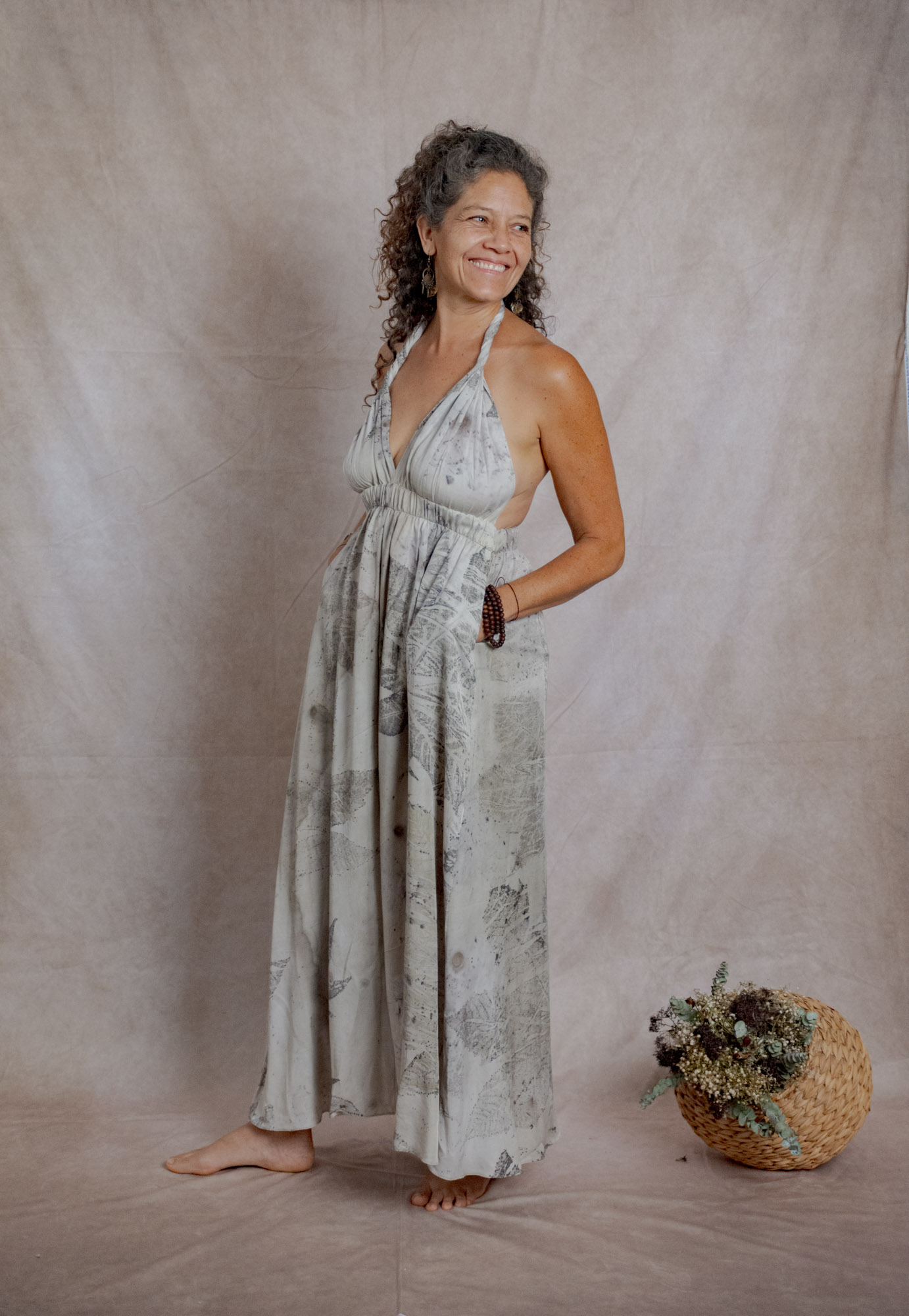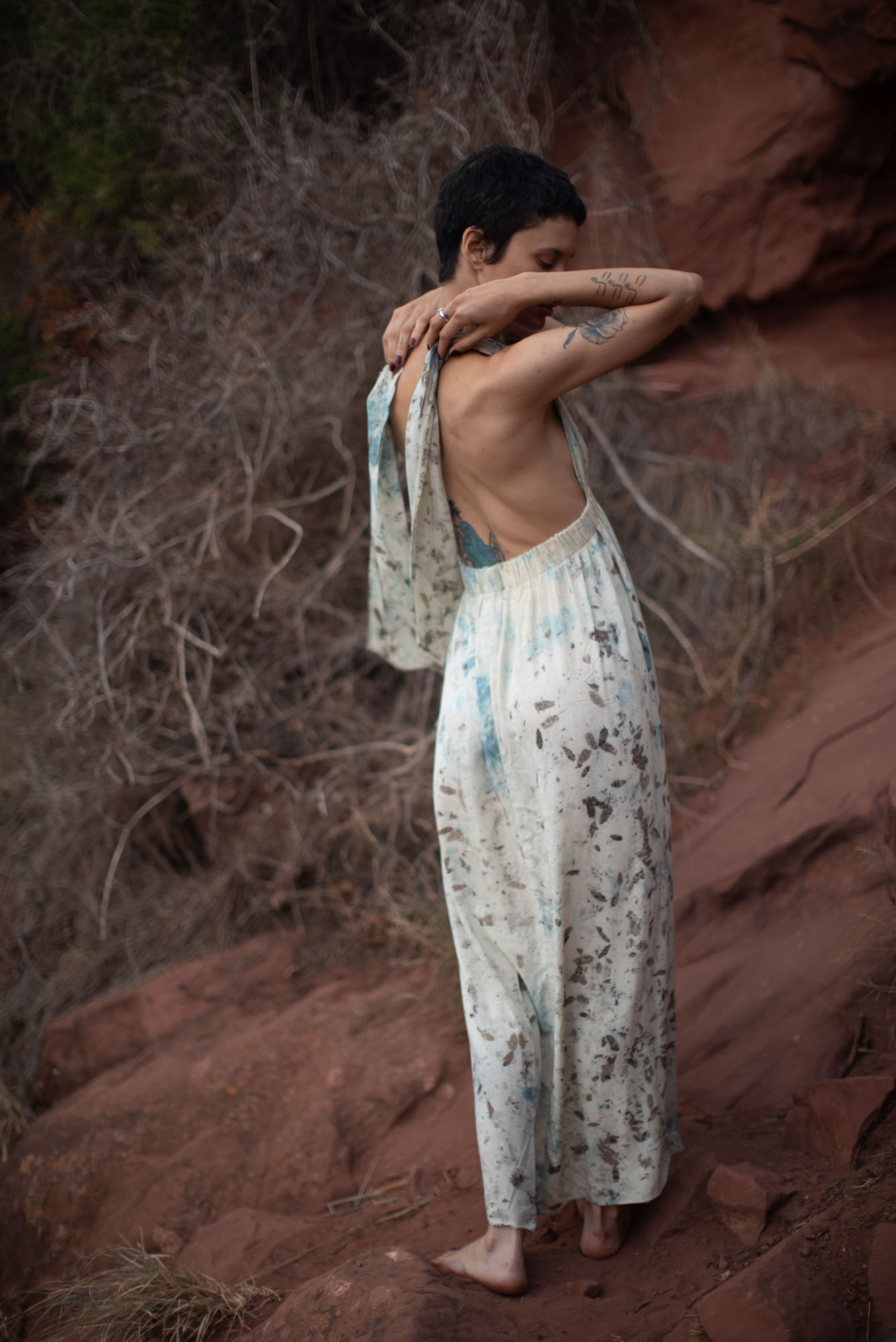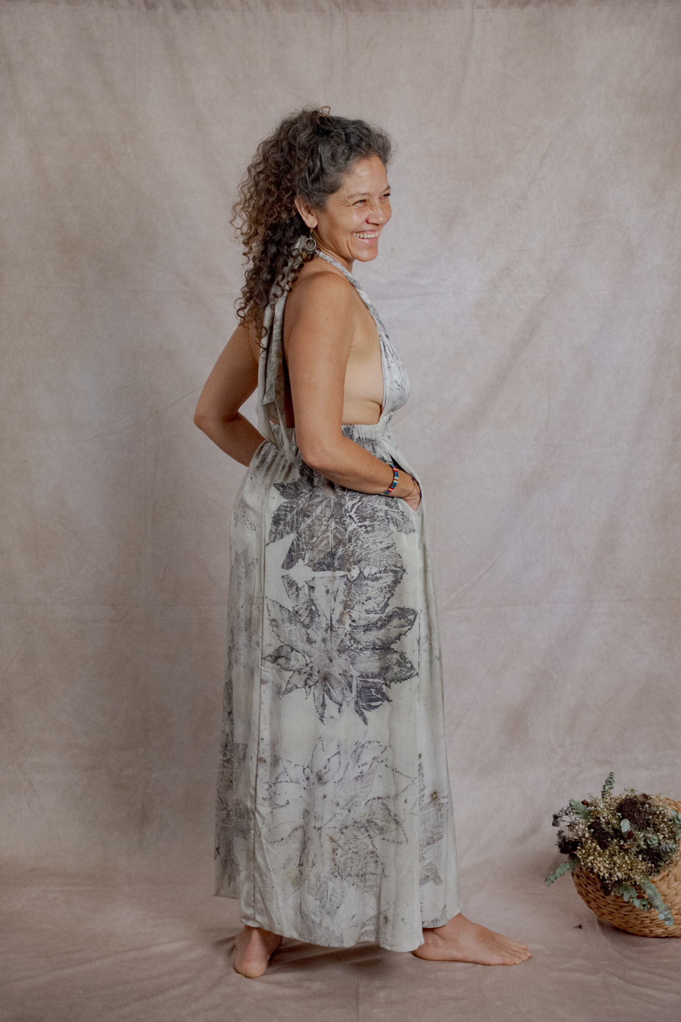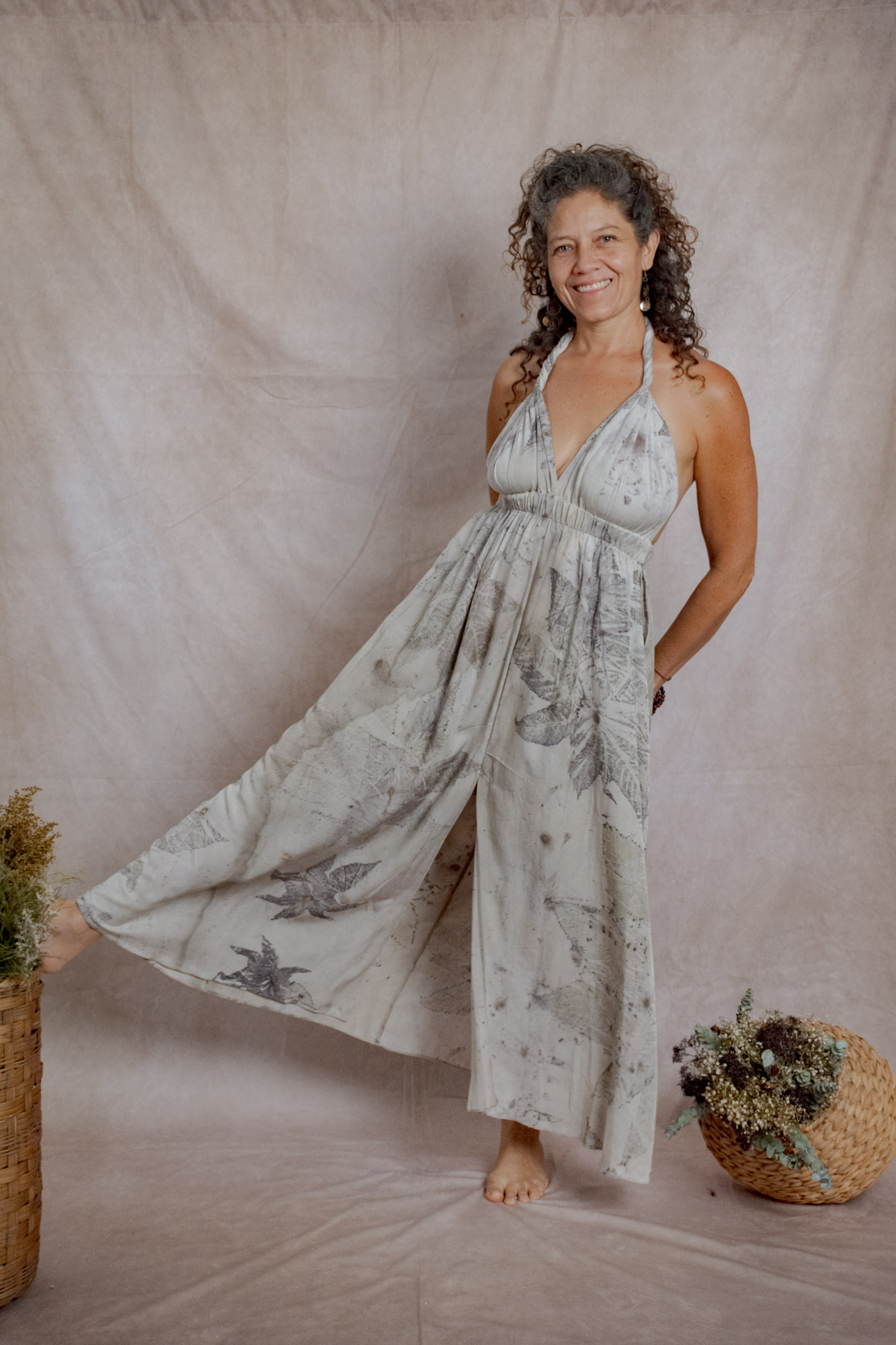 Envíos a nivel NacionalVestido doble propósito que se puede usar como vestido o como falda, teñido con tintes naturales y estampado con plantas. Pieza única e irrepetible.