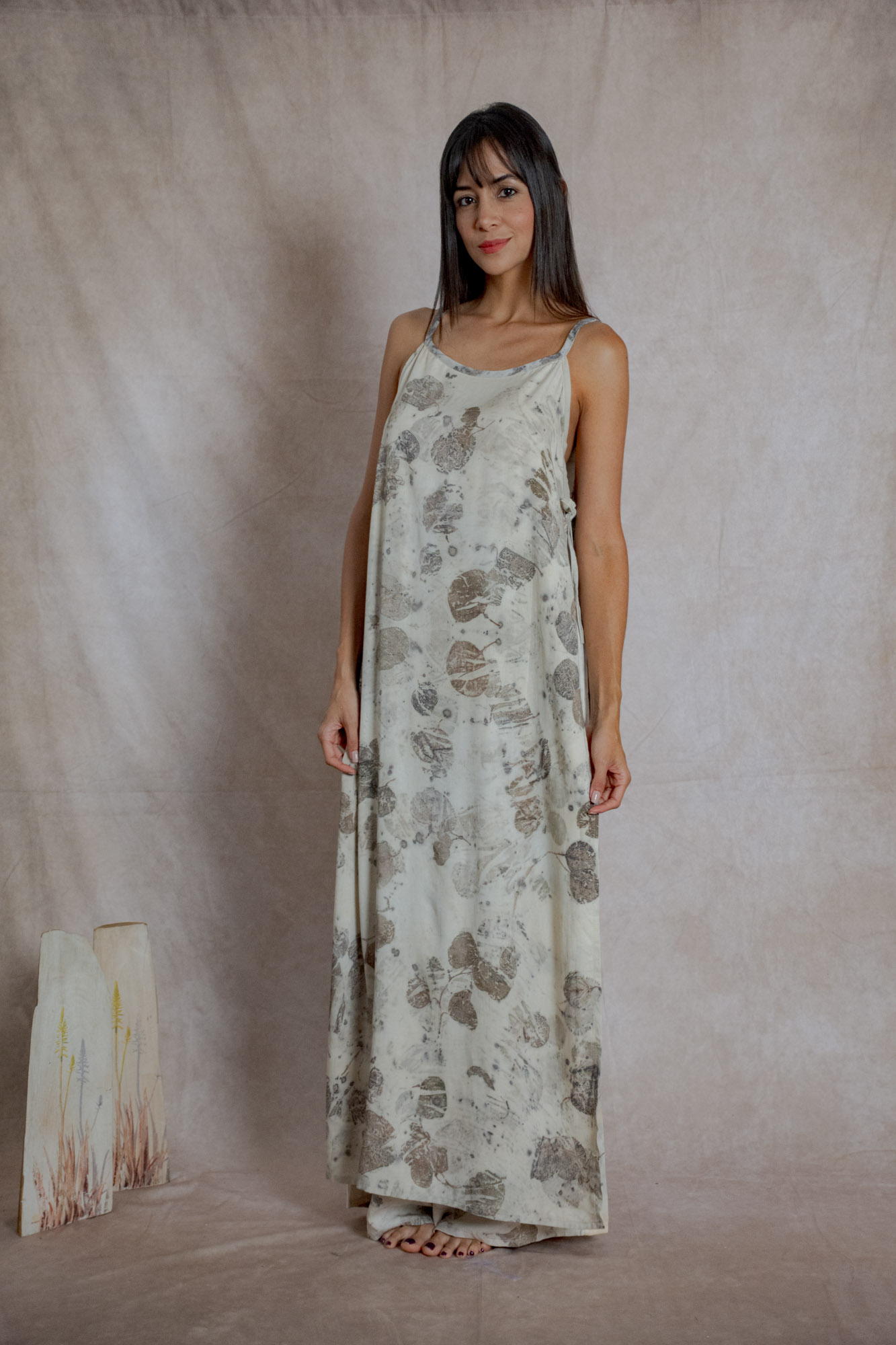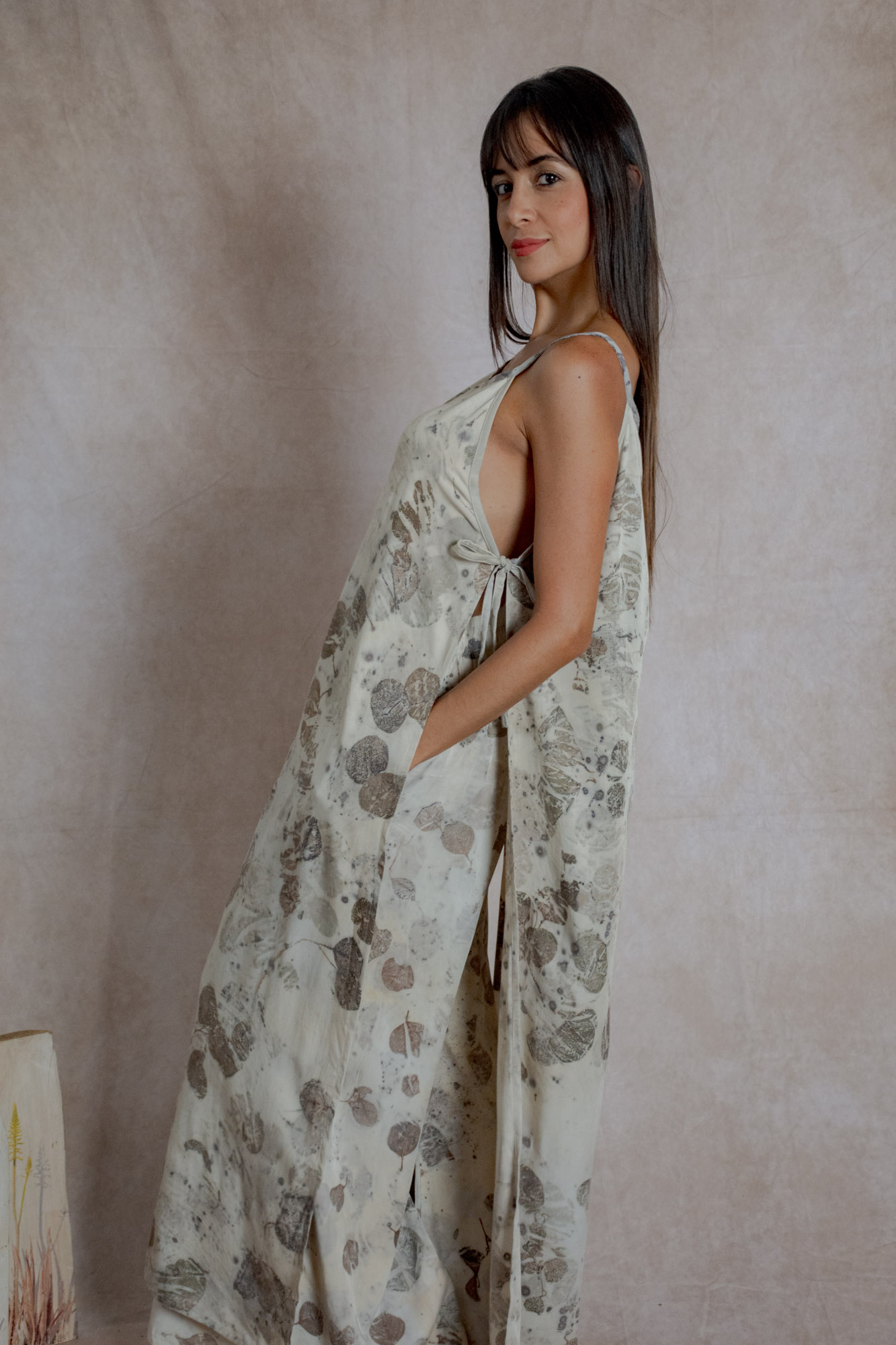 Vestido tipo peto, teñido con tintes naturales y estampado con plantas. Pieza única e irrepetible.