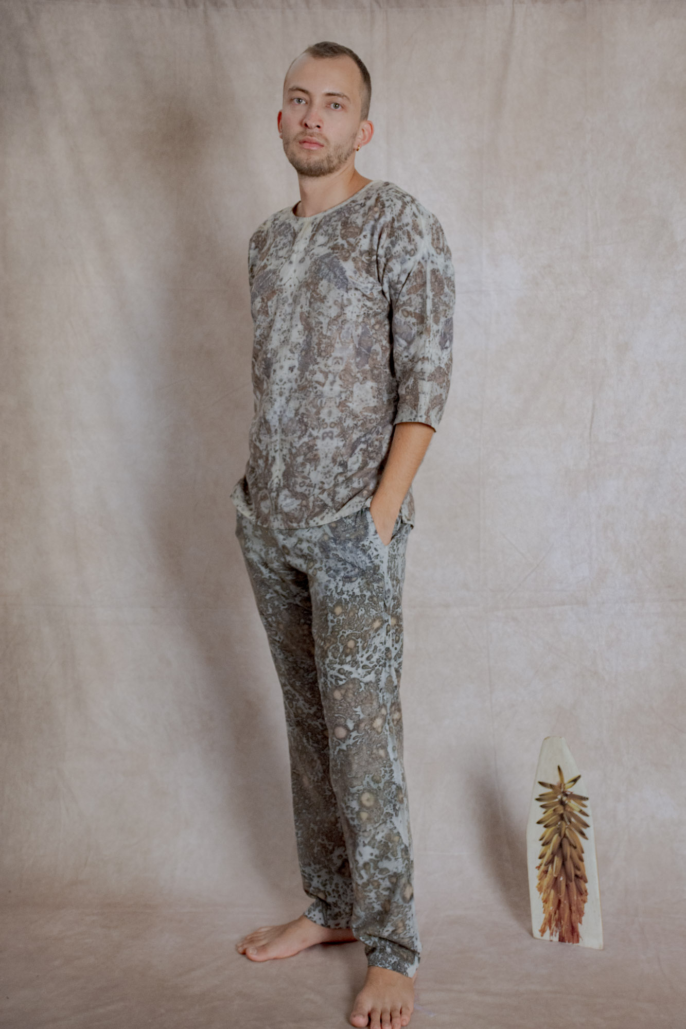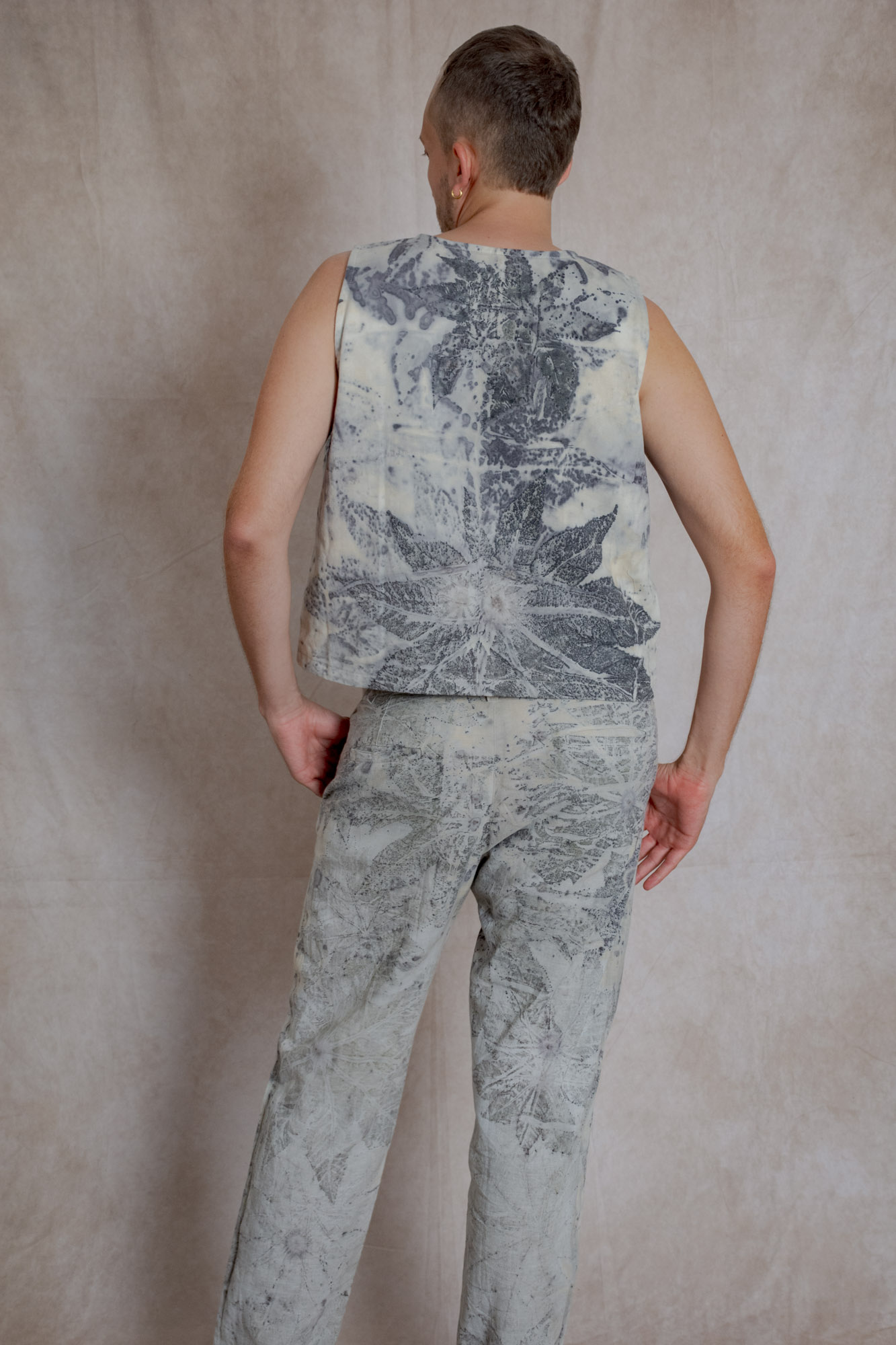 Pantalón clásico de hombre, teñido con tintes naturales y estampado con plantas. Pieza única e irrepetible.