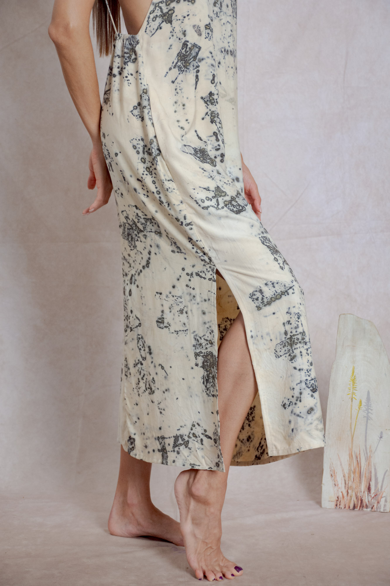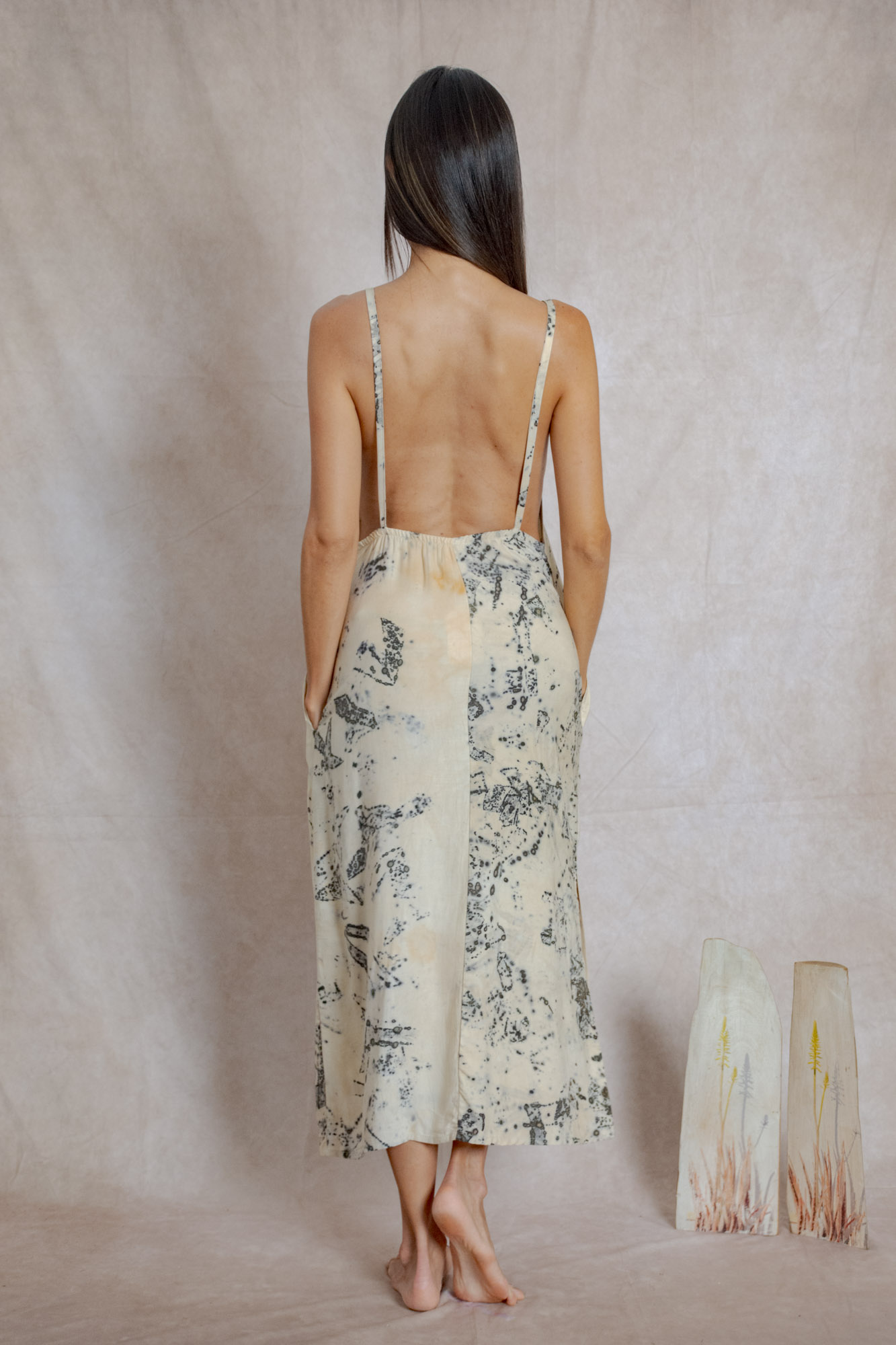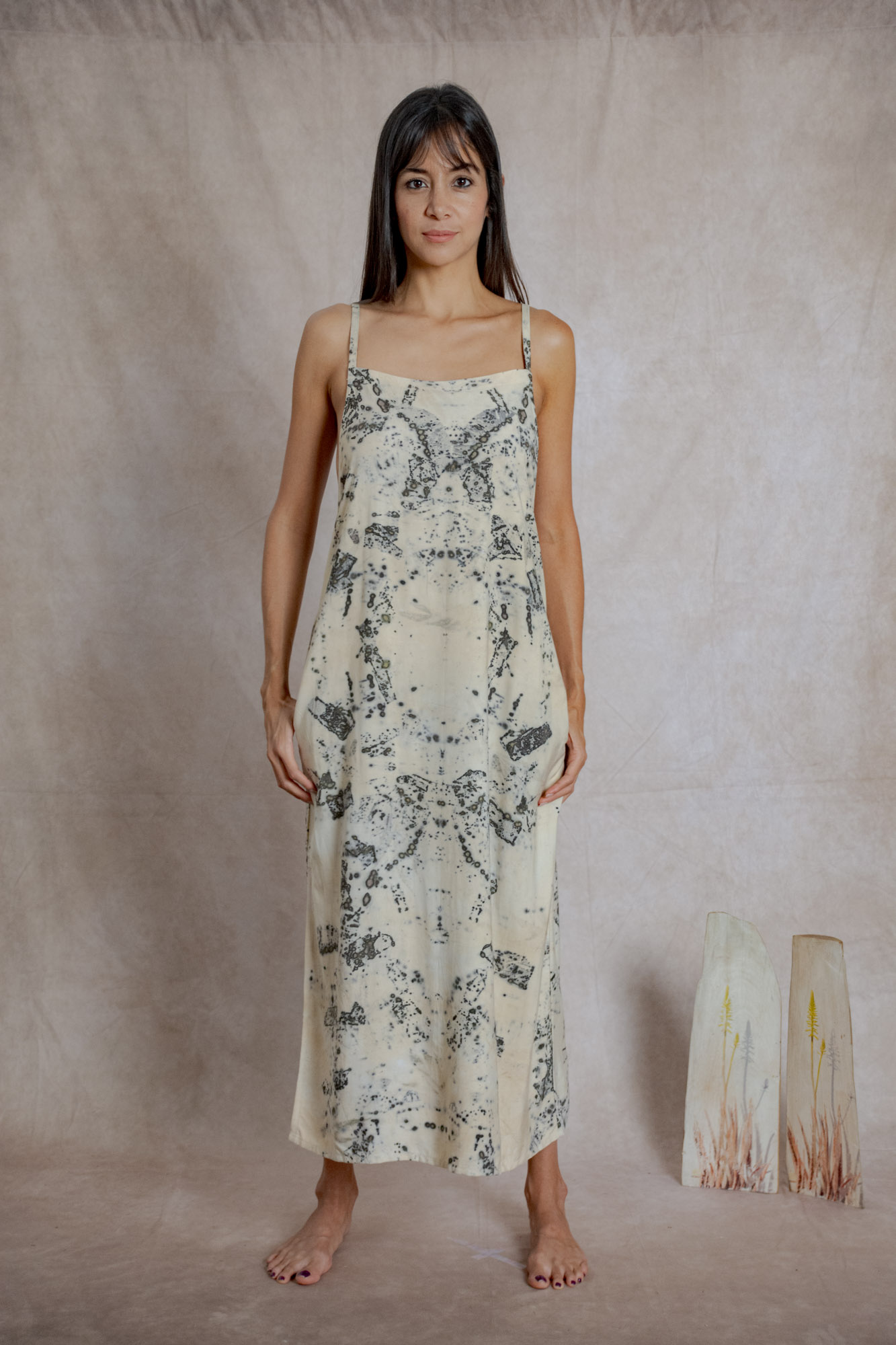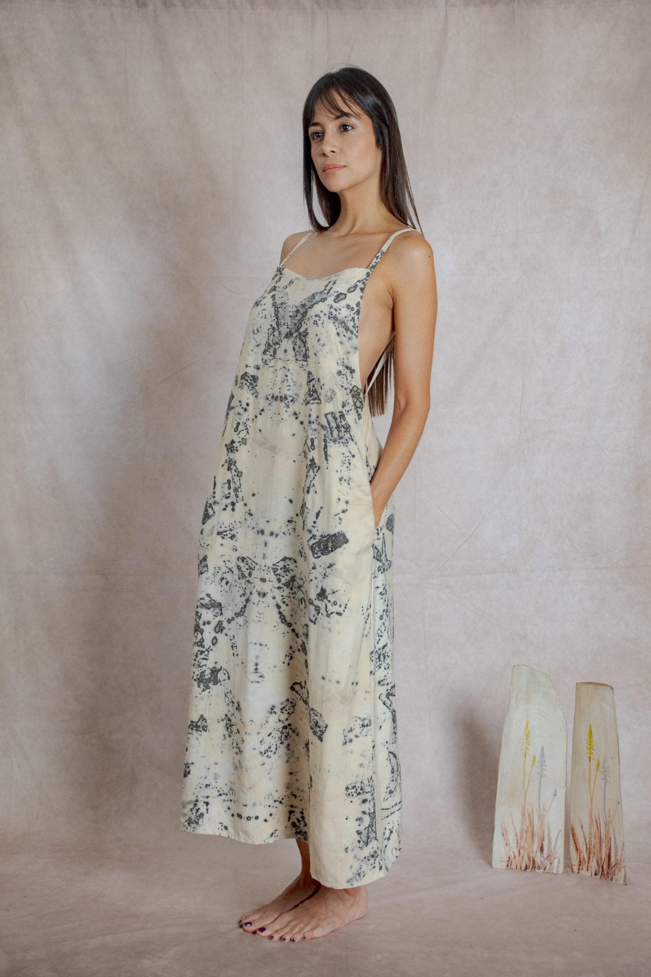 Envíos a nivel NacionalVestido ultra liviano, teñido con tintes naturales y estampado con plantas. Pieza única e irrepetible.
